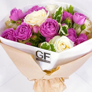 Малиновое пралине- букет из альстромерий, роз и эустом