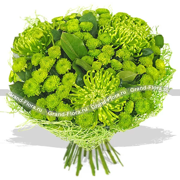 Обворожительная композиция из зеленых крупных и мелких хризантем с изящными веточками. Хризантема – тот цветок, вокруг которого рассказываются интересные истории и легенды. Хризантема символизирует долгую и счастливую жизнь и чаще всего дарится замужним женщинам. Зеленый цвет олицетворяет мир и спокойствие. Такой букет поможет укрепить дружбу, привнесет яркость в любое мероприятие.