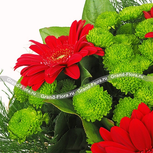 Обворожительный букет с безумно яркими, пылающими герберами. Эти цветы символизируют солнце, улыбку, а также выражают свою симпатию от дарителя. Удачно вписанные хризантемы и листочки зелени создают гармоничный контраст красного с зеленым. Хризантемы олицетворяют открытость, намекая на дружеские чувства и возможно нечто большее. Такой букет подойдет в качестве подарка другу или подруге, он также выразит только зарождающиеся чувства.