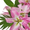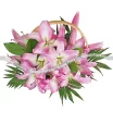 Уменьшенный: лилия розовая - 2 шт., салал, лист рабелини - 3 шт., оазис, корзина.