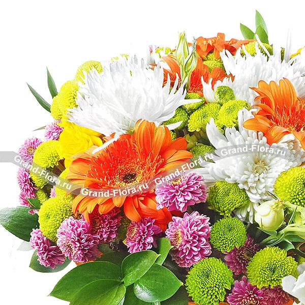 Сдержанный, но выразительный смешанный букет для вручения мужчине.Центр композиции составляют оранжевые герберы. Дополняют солнечные цветы несколько видов нежных хризантем, а также желтые элегантные кустовые розы. Белая эустома и рускус превосходно подчеркивают всю прелесть букета.