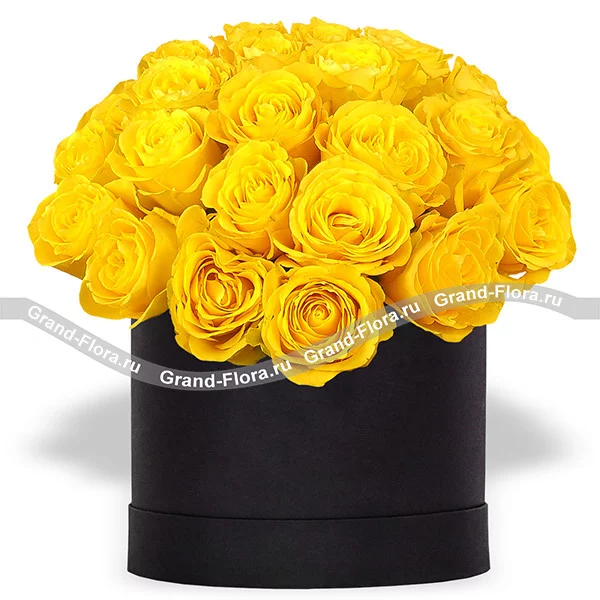 29 роз: роза желтая - 29 шт., коробка круглая (18*18) - 1шт., оазис.