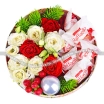 Стандартный: роза красная - 3 шт., роза кустовая белая - 3 шт., гиперикум - 1 шт., ель, конфеты Raffaello, елочная игрушка – 1 шт., оазис, коробка.